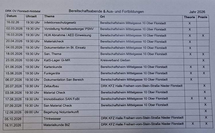 Die Bereitschaft trifft sich jeden 1. und 3. Montag im Monat ab 19:30 Uhr zu Bereitschaftsabenden in unserer Unterkunft im "ehemaligen Feuerwehrgerätehaus" in Ober - Florstadt, Mittelgasse 10. Dort wird durch Sanitäts- und Betreuungsausbildungen, zahlreiche Übungen und Fortbildungen ein hoher Ausbildungsstand geschaffen und erhalten. Weiterhin werden Dienste verteilt und der Dienstplan besprochen. In unserer Bereitschaft sind vom Betreuungs- und Sanitätshelfer bis zum Notfallsanitäter alle Qualifikationen vertreten. Sie übernehmen vielfältige Aufgaben. So betreuen sie unsere Blutspende oder Veranstaltungen im Sanitätsdienst . Auch für den Notfall - wie ein Zugunglück oder Großbrand - sind sie bestens gerüstet und für den Schutz unserer Bevölkerung im Einsatz.